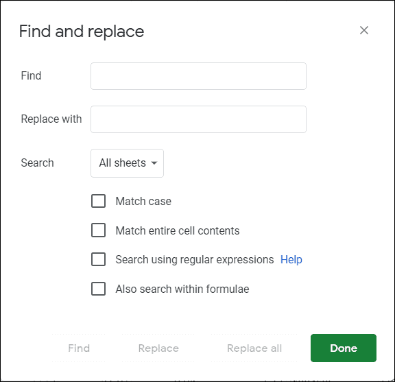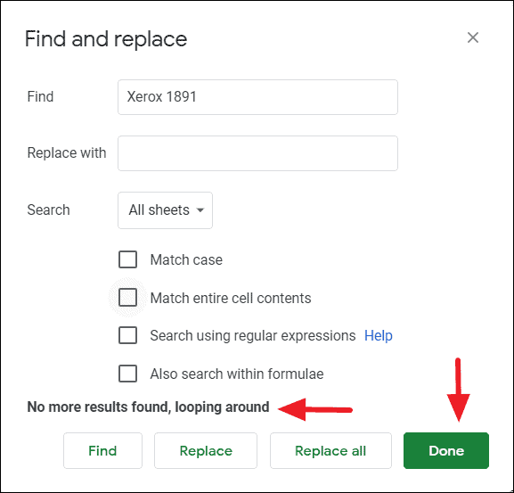 Step 10: After completing your search and any replacements, click the green Done button to close the dialog box.