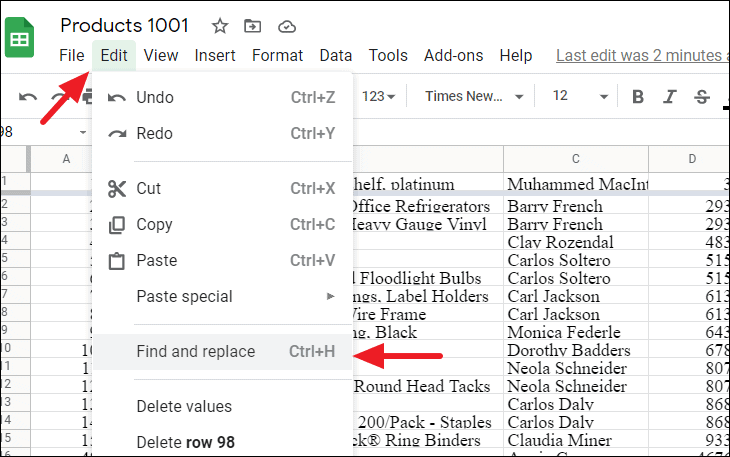 Step 2: Click on the Edit menu at the top of the screen and select Find and replace from the dropdown list.