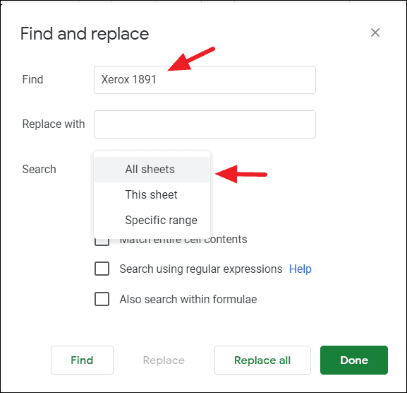 Step 5: To ensure the search covers all sheets in your workbook, click on the dropdown menu next to Search and select All sheets.
