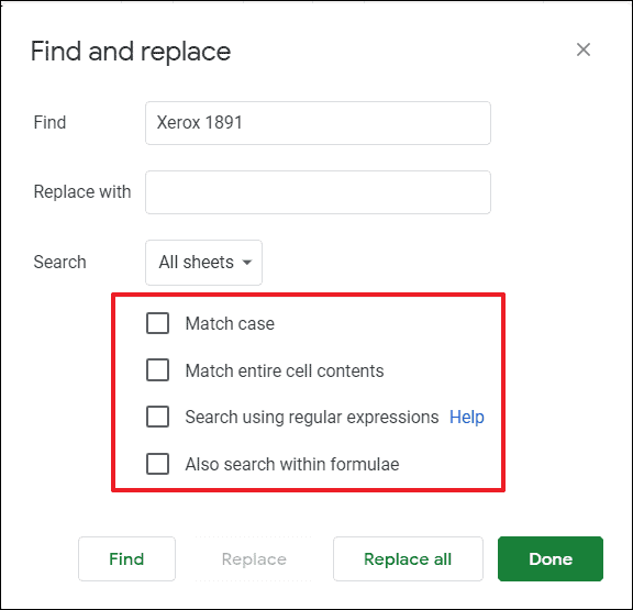 - Match entire cell contents: Finds cells that exactly match the search term without any extra characters.