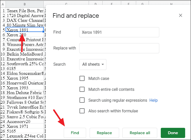 Step 4: In the dialog box that appears, enter the word or phrase you're searching for into the Find field. For example, type "Xerox 1891".