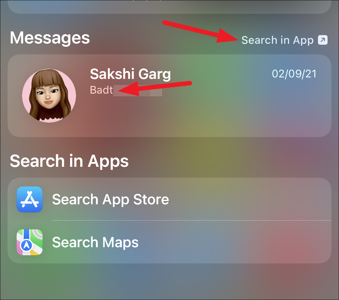 Step 3: Scroll through the search results to locate the Messages section. If the specific message appears, tap on it to open the conversation. If you don't see it, select Search in App to view more results directly within the Messages app.