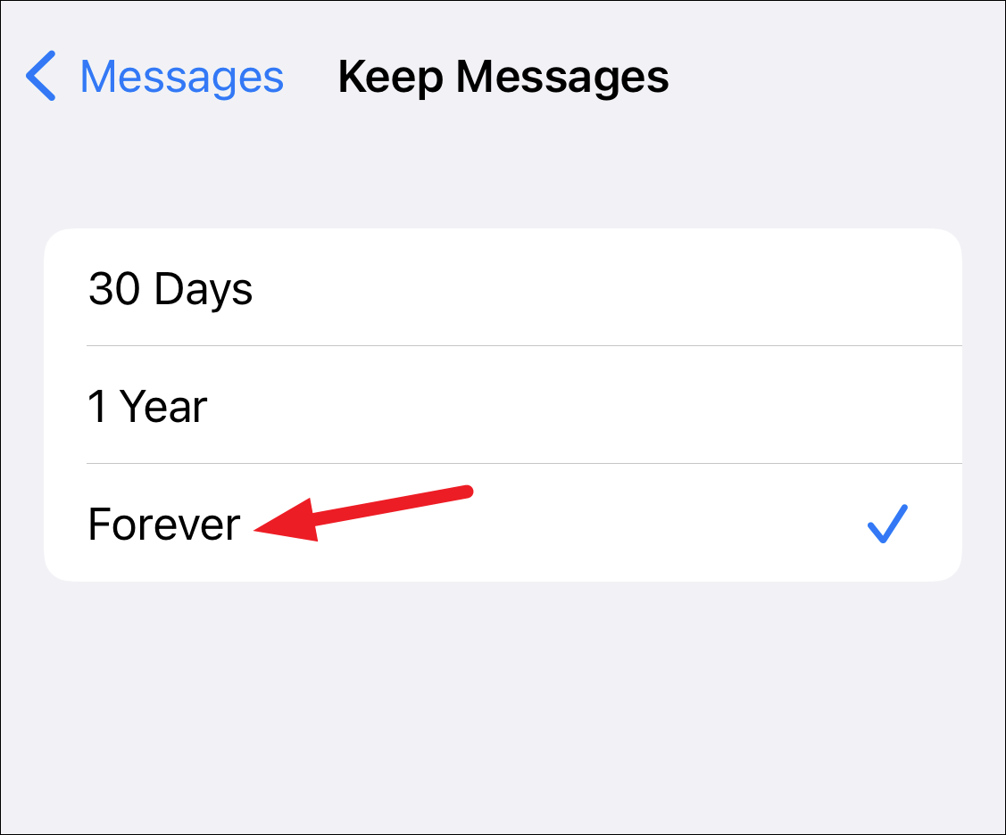 Step 4: To prevent future messages from being deleted, tap on Keep Messages and select Forever. Be aware that choosing this option will consume more storage space on your device. If storage is a concern, selecting 1 Year might be a suitable compromise.