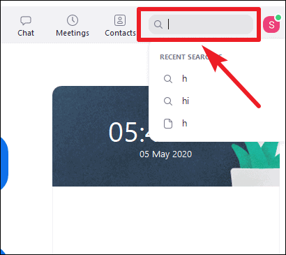 Using the search box, you can search for messages as well as files shared with other people. Open the Zoom desktop client, and go to the Search box towards the top of the screen.
