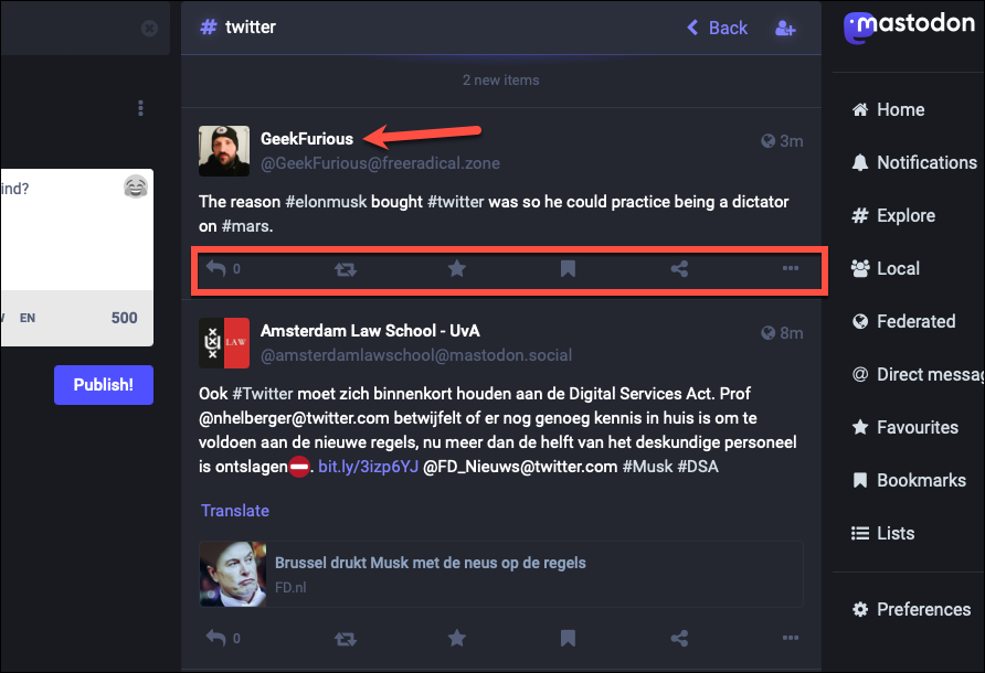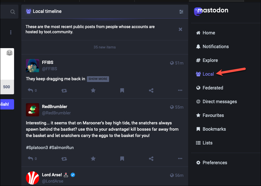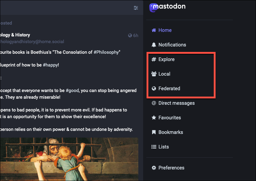 On the right, there are three options: ‘Local’, ‘Federated’, and ‘Explore’. You can use all these places to discover new public posts.