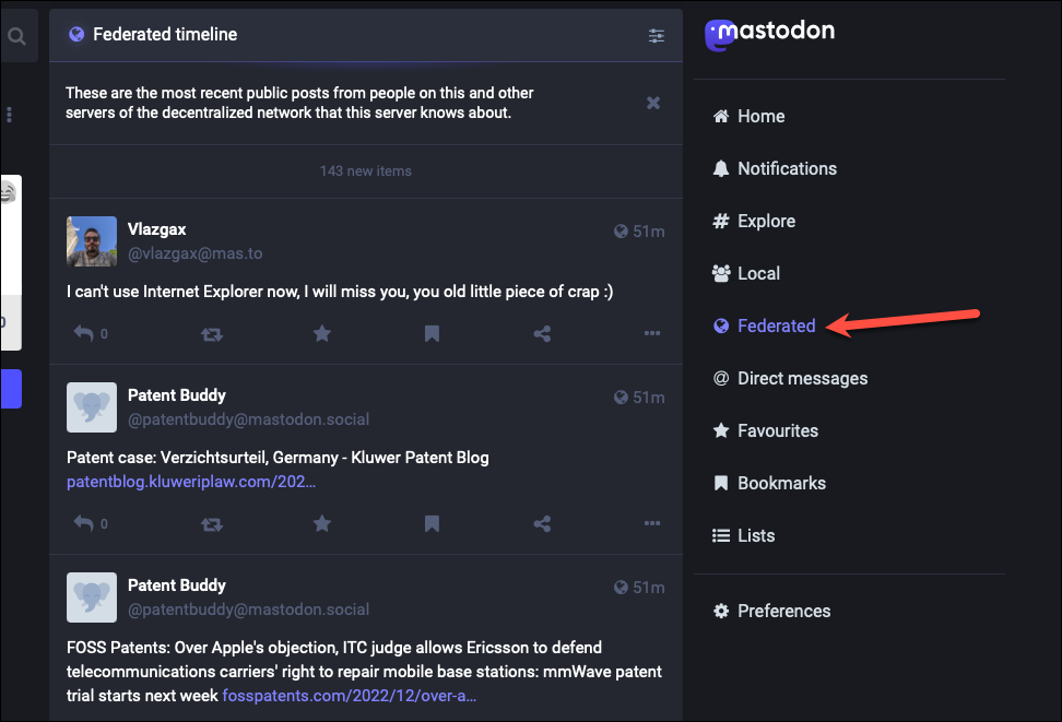 The Federated feed shows the most recent public posts from users on your server as well as other servers of the Mastodon network that your server knows about.