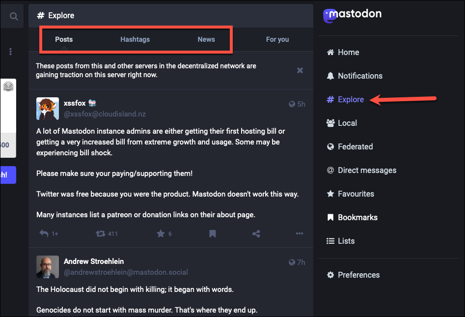 The Explore feed, on the other hand, shows posts from your and other servers that have been gaining traction on your server, i.e., local posts that are popular and posts from other servers that are popular with users of your server. You can switch between ‘Posts’, ‘Hashtags’, and ‘News’ to find new content from the Explore feed.