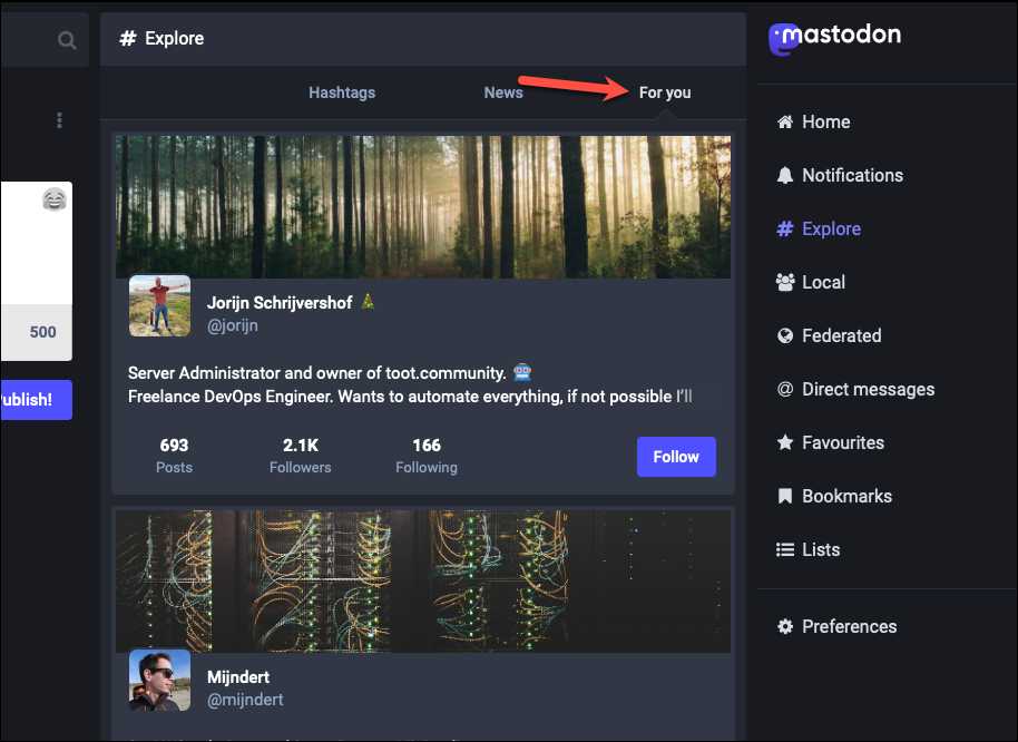 To find more people to follow on Mastodon, go to the ‘For You’ tab from your Explore feed.