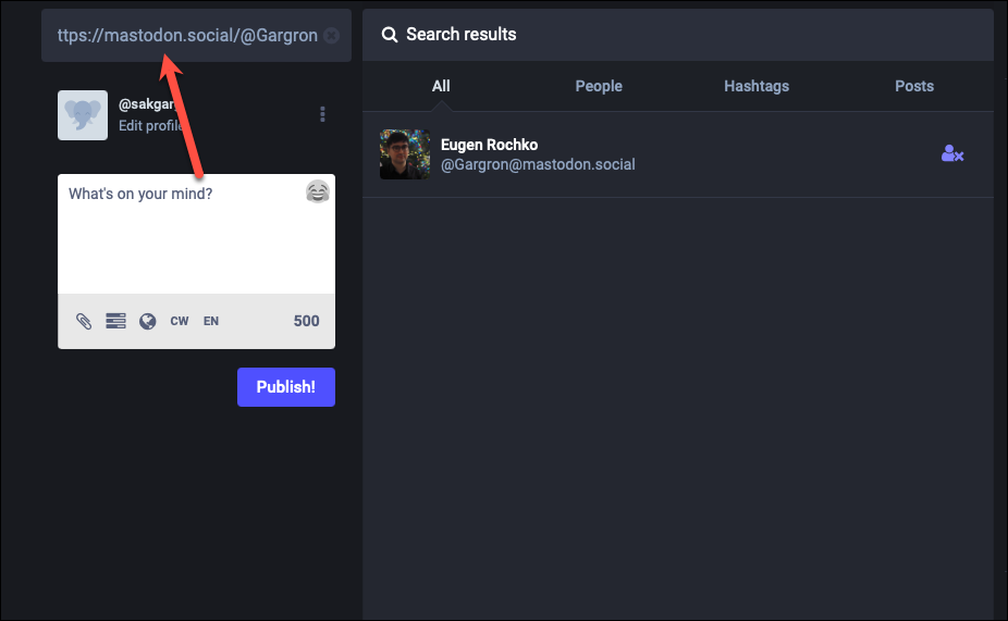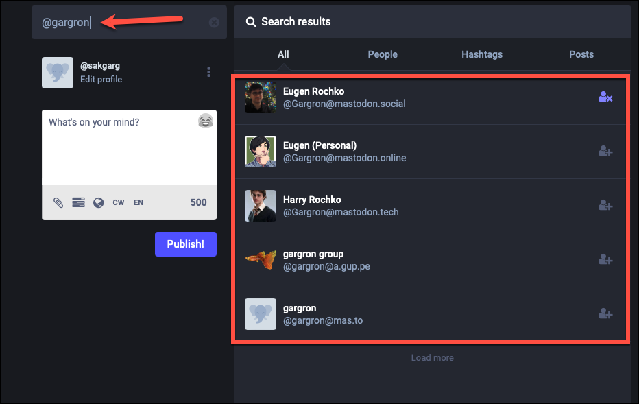 So, to search for Eugen Rochko whose username is ‘Gargron’, enter @Gargron@mastodon.social in the search field and press Enter.