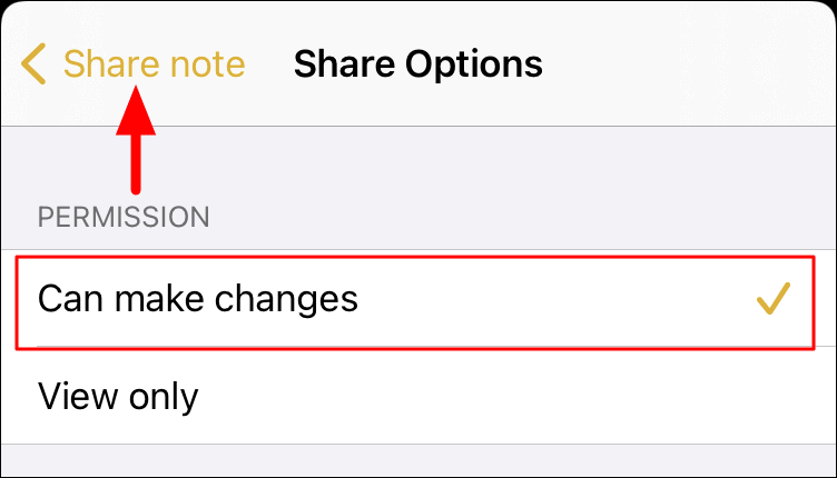 Since we are sharing the note with the aim of chatting, ensure that the ‘Can make changes’ option is selected. Next, tap on the ‘Share note’ icon at the top to go back to the last screen.