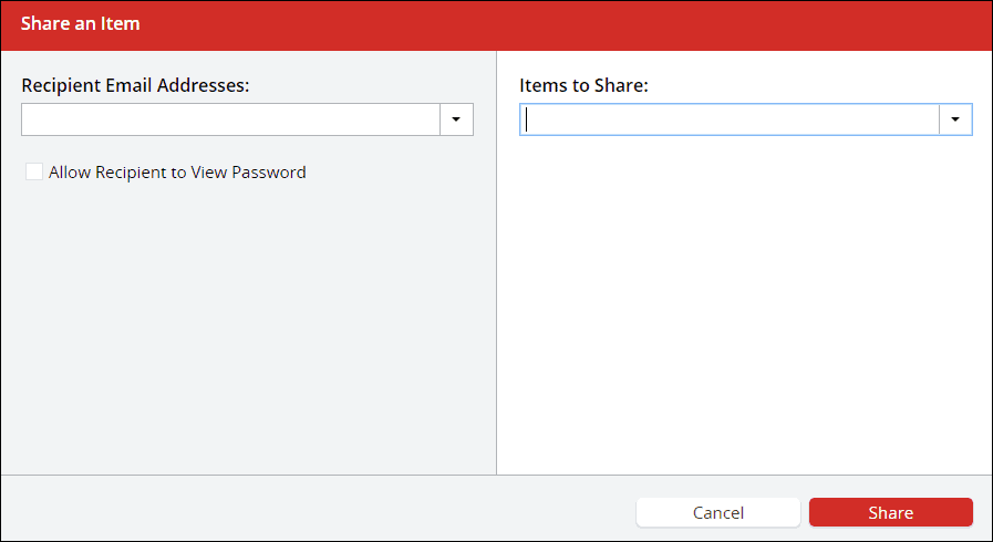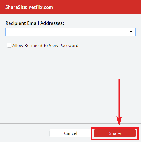 Step 2: A dialog box will appear prompting you to enter the recipient's email address. Type in the email address of the person you want to share the password with, and then click the Share button at the bottom. The recipient will receive an invitation to accept the shared credentials.