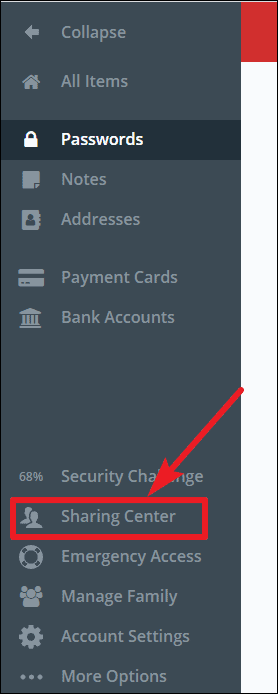 Step 1: To access the Sharing Center, open your LastPass vault and click on Sharing Center from the menu on the left side of the screen.