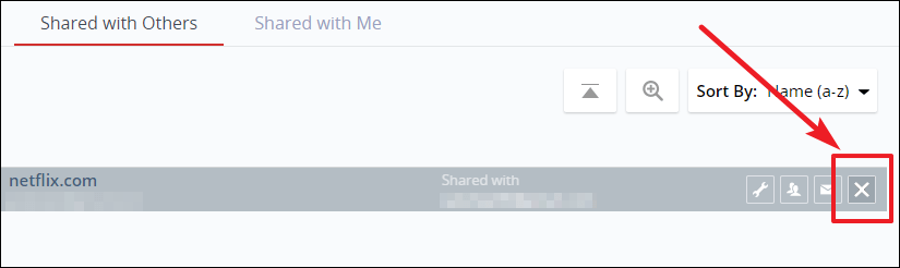 Step 3: If you need to revoke access to a shared password, you can do so at any time from the Sharing Center. Since the recipient never sees the actual password, you don't have to change it after revoking access. To remove someone's access, hover over the shared item and click the Cancel (X) button.