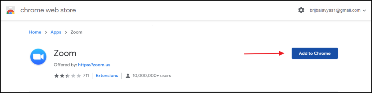 Step 1: On the Zoom app page in the Chrome Web Store, click the 'Add To Chrome' button to initiate the installation process.
