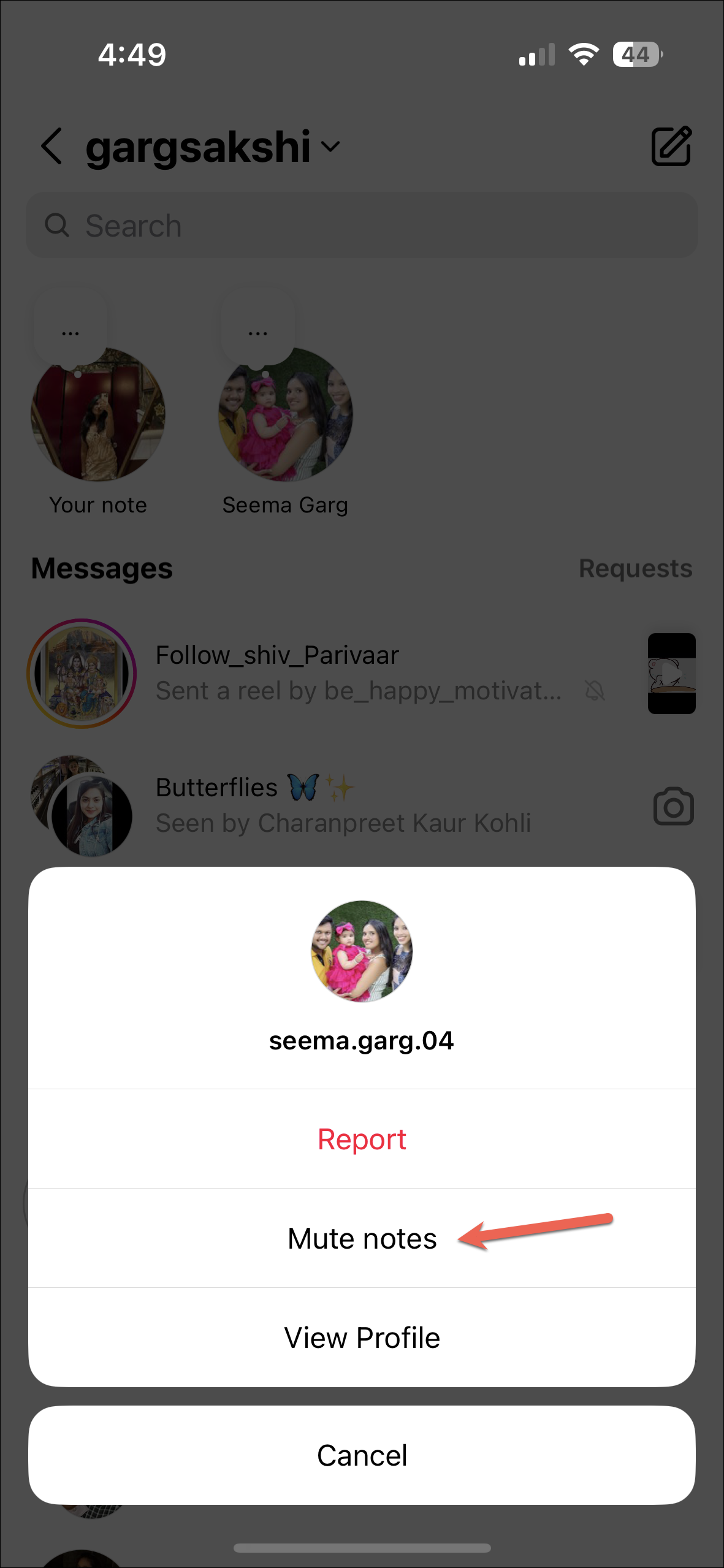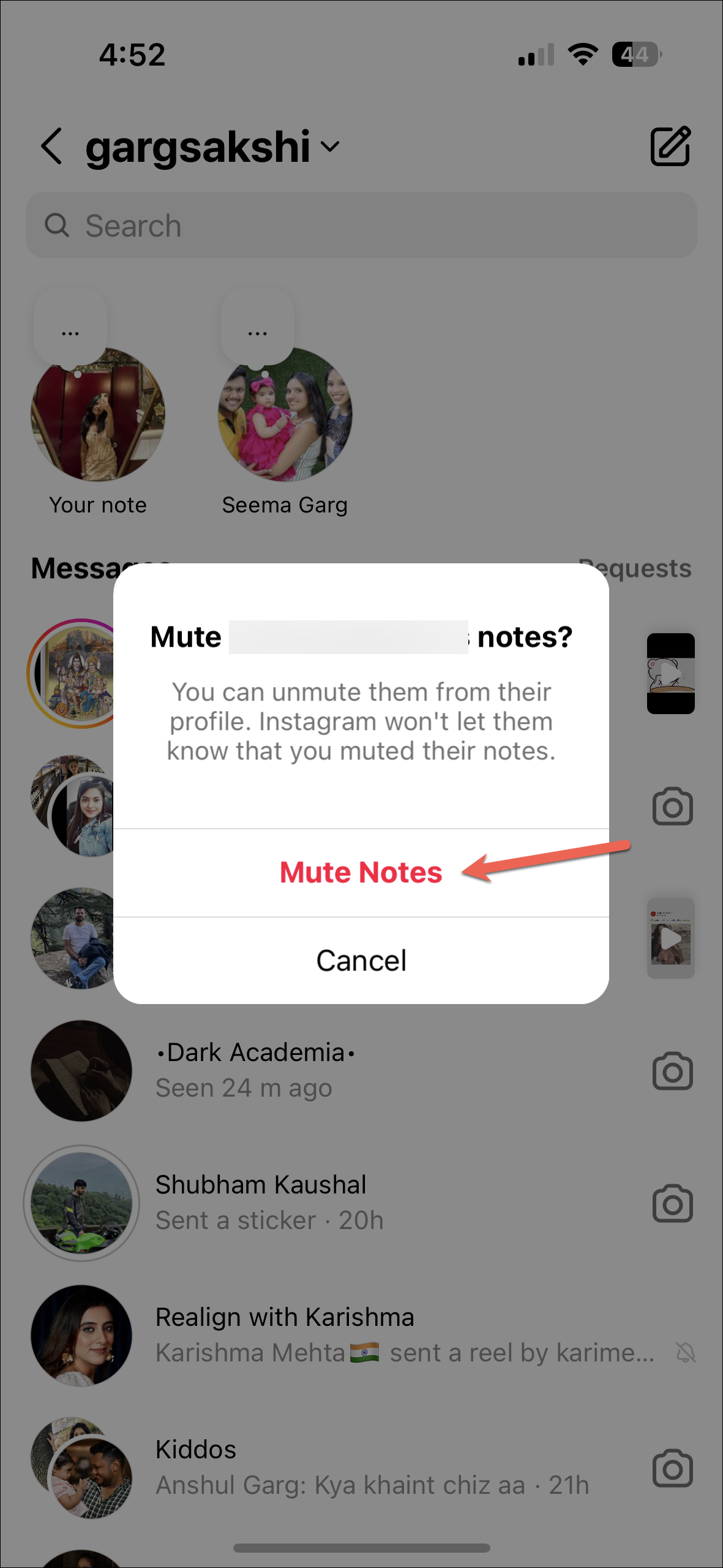 - You can also mute notes from people; muting the notes does not apply to their stories or posts. Tap and hold the note. Then, select 'Mute Notes' from the options.