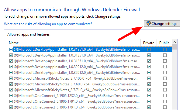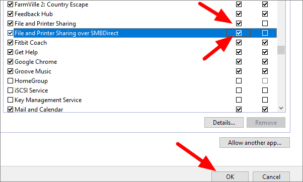 Now, find ‘File and Printer Sharing’ and ‘File and Printer Sharing over SMBDDirect’ in the list and and tick the checkboxes under private. Click on ‘OK’.
