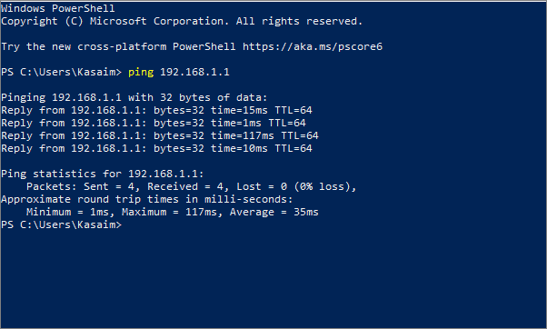 In the Windows PowerShell terminal, enter the ping command followed by your IP address and press enter.