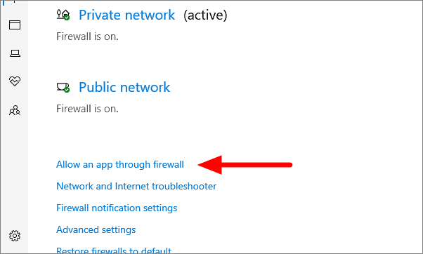 On the next window, click on the first option at the bottom which is ‘Allow an app through firewall’.