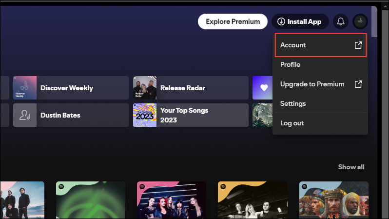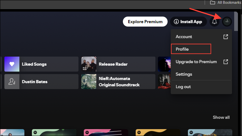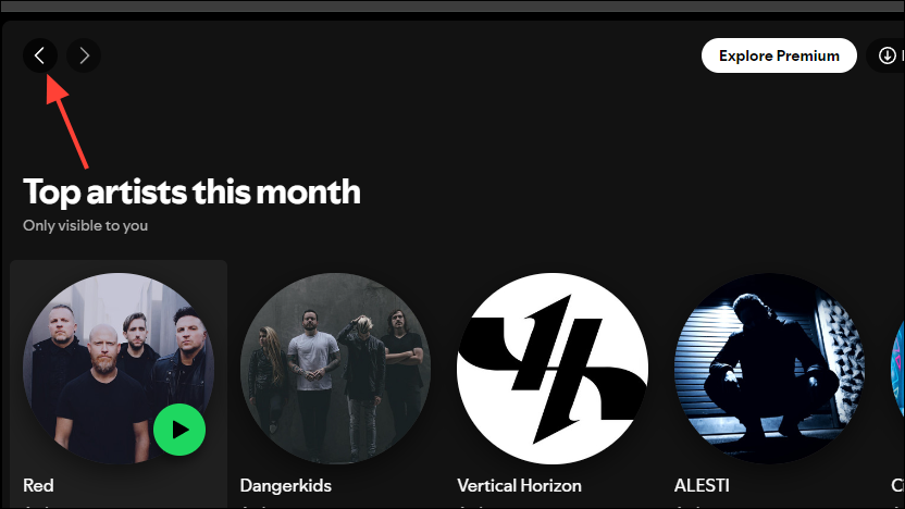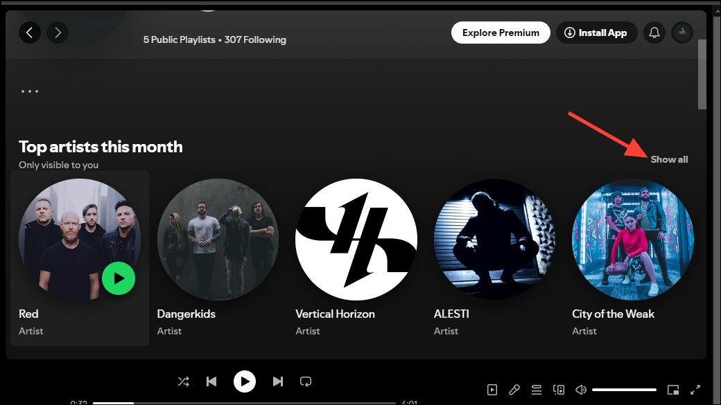- On the Profile page, you will see a 'Top artists this month' section. You can click on it or on the 'Show all' option on the right to view all your favorite artists of the month.