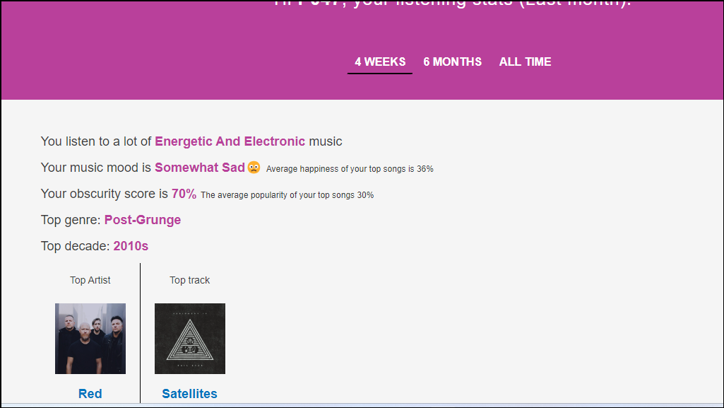 - Now, you can see all your Spotify data on the website. You can switch between data for four weeks, six months, and all-time by clicking on the respective option at the top.