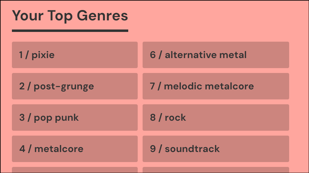- Once you log in, you will be able to see information pertaining to your music preferences. The website will first show you your favorite genres.