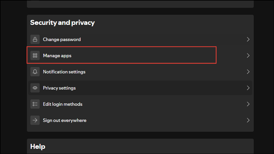 - On the Account page, scroll down to the Security and Privacy section and click on 'Manage apps'.