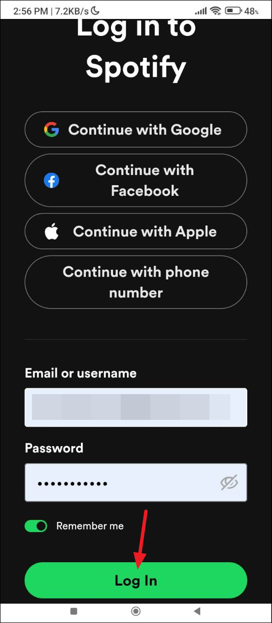 - Enter your credentials and tap on the 'Log In' button. You can also log in using your Facebook, Google, or Apple account or your phone number.