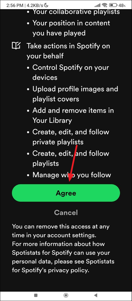 - You will need to grant access to the app so it can see your Spotify data. Tap on the 'Agree' button on the next page.