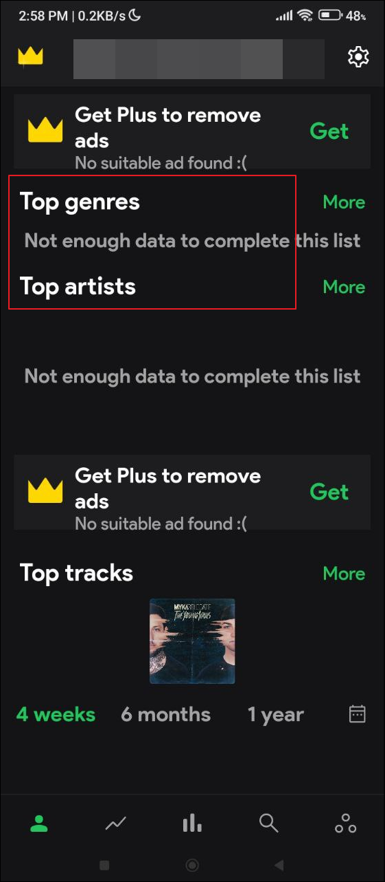 - Finally, you will reach the homepage of the app. Here you can tap on different sections, like 'Top genres' or 'Top tracks' to view the relevant information.