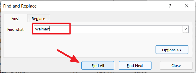 In the Find and Replace dialog, type the value you want to highlight in the ‘Find what’ field. Here, we’re typing “Walmart”. Then, click the ‘Find All’ button.