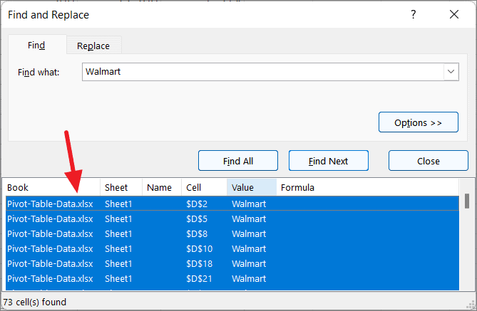 The box below the Find and Replace dialog will list all the findings that match the keyword (Walmart). Now, simply press Ctrl + A to select all the cells that were found.