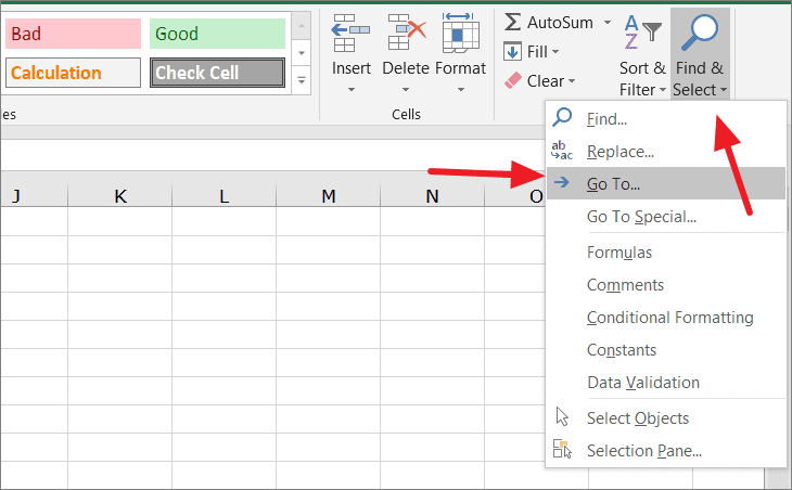 On the Home tab of the Ribbon, click the ‘Find & Select’ option and select ‘Go To’ or simply press the F5 function key.
