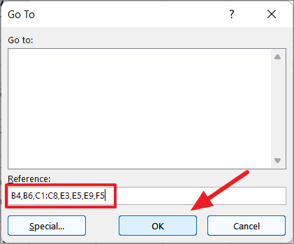 Now, you will see the Go To dialog box. In the ‘Reference’ box, type the cell references or range of cells that you want to select, separated by a comma. Then, click ‘OK’ or just hit Enter.