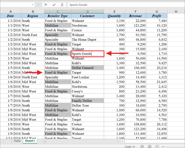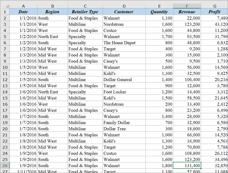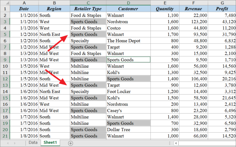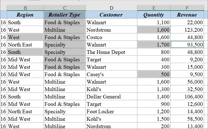For example, in the below table you have multiple retailer types and you may want to select all the cells that have the retailer type ‘Walmart’. Then, follow these steps: