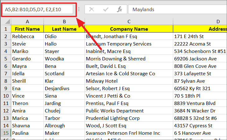 For instance, let’s assume you want to highlight the following non-adjacent cells and ranges – A5, B2:B10, D5, D7, E2, E10. Here, how you do it: