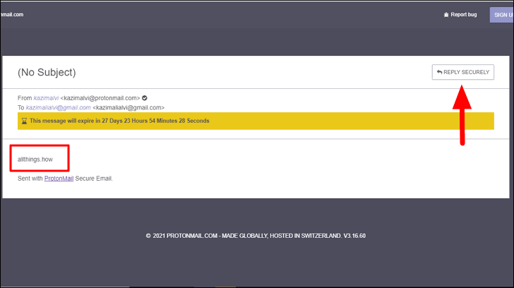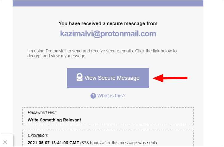 After you have hit the ‘Send’ button, the recipient will receive a mail that displays your ProtonMail ID, the password hint, and the expiration time. To view the content, the user would have to click on ‘View Secure Message’ in the center.