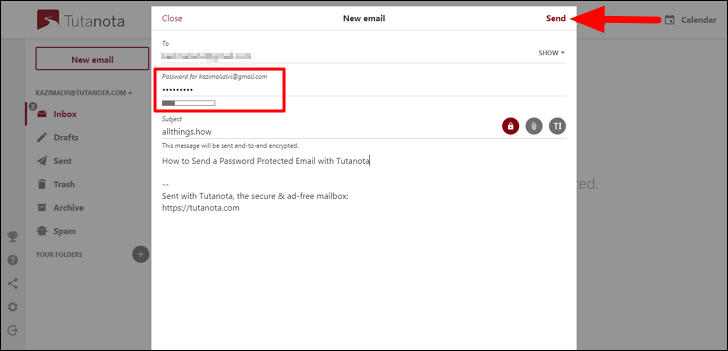 Next, enter the recipient’s email ID in the box under ‘To’. As soon as you enter it, the password text box appears where you can set a password for the email. Tutanota also displays the password strength using a bar under the password section. Now, enter the subject and the content in the respective section. Once you have drafted the complete email and set a password for it, click on ‘Send’ at the top-right corner of the window.