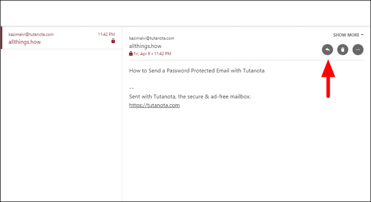 The Tutanota mailbox will open, where all the email(s) sent by you to the recipient will be visible. Also, to reply to the email, simply click on the ‘Reply’ icon near the top-right corner.