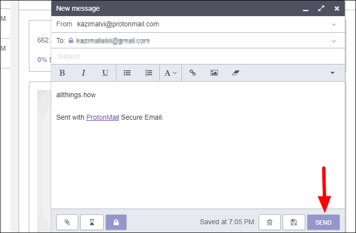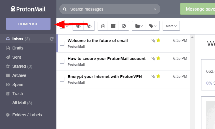 After creating an account, login to ProtonMail dashboard and click on the ‘Compose’ icon near the top-left corner to open the ‘New Message’ window.