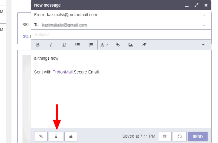 In the New message box, enter the Email id of the recipient in the ‘To’ section and the subject (optional) in the box under it. Now you can enter the content of the email and attach files to it. ProtonMail also offers the option to change the ‘Expiration time’ for an email. The default setting is 28 days for mails sent to non-ProtonMail users. To change it, click on the ‘Expiration time’ icon which resembles a sand clock.