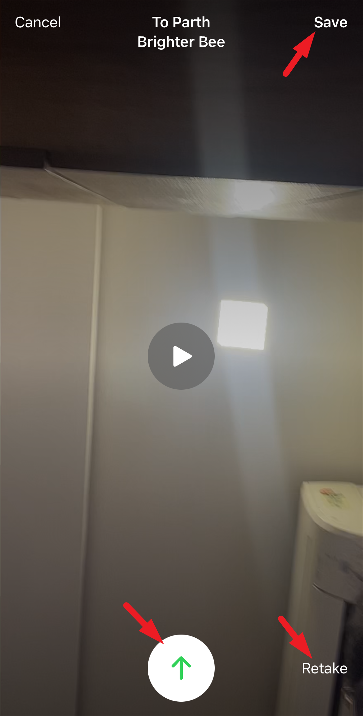 - After recording a video, tap the green 'Arrow' button to send it. You can also save the video in your gallery by tapping 'Save' in the top right corner.