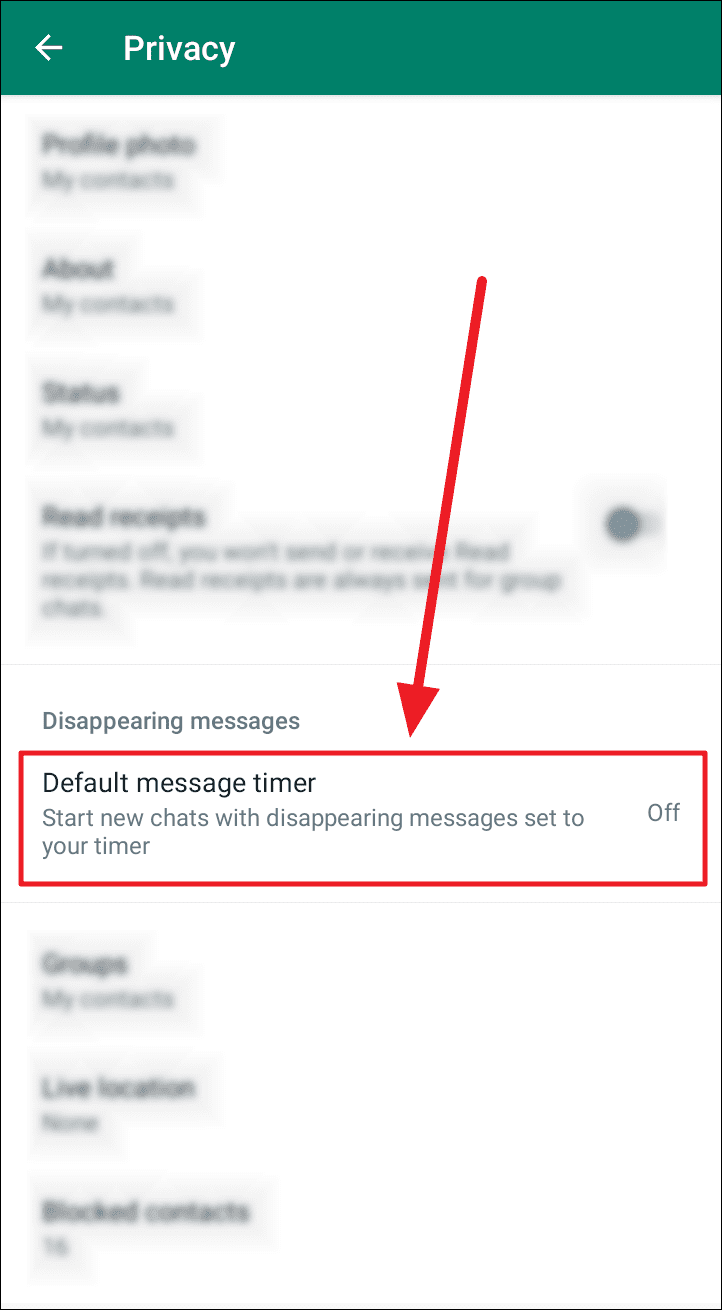 Tap the ‘Default message timer’ option below the ‘Disappearing messages’ title on the ‘Privacy’ screen.