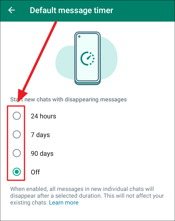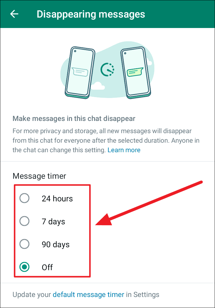 You will view a familiar screen but with a different name – the ‘Default message timer’ screen. This is the same as the ‘Disappearing Messages’ screen. Here too, tap the radio button in front of the duration of your choice. Hit the ‘OFF’ button to disable the feature.