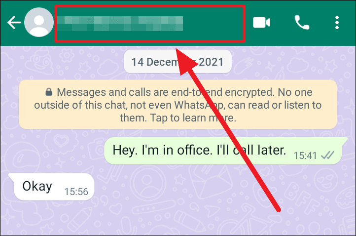 Launch WhatsApp on your device and open the chat you want to enable disappearing messages for. It can be a personal or a group chat. Tap the name of the person/group.