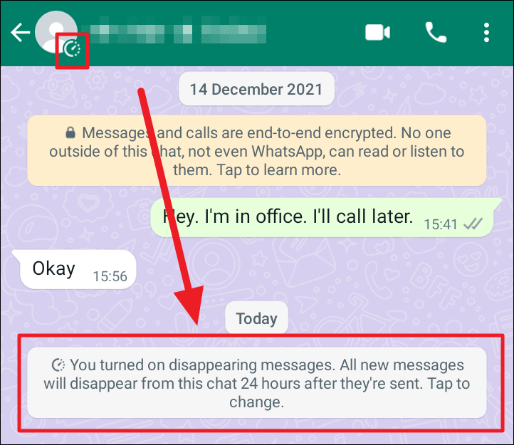 All your messages in the chosen chat will disappear after the chosen duration. You will see a timer icon to the bottom of the contact/group’s display picture in addition to a notification informing that ‘Disappearing messages’ is turned on. The notification will also have the duration you have chosen.