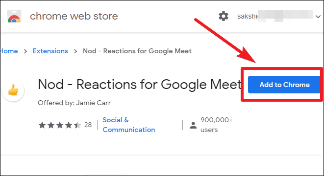 Step 1: Go to the Chrome Web Store and open the Nod - Reactions for Google Meet extension page. Click on the 'Add to Chrome' button to start the installation.