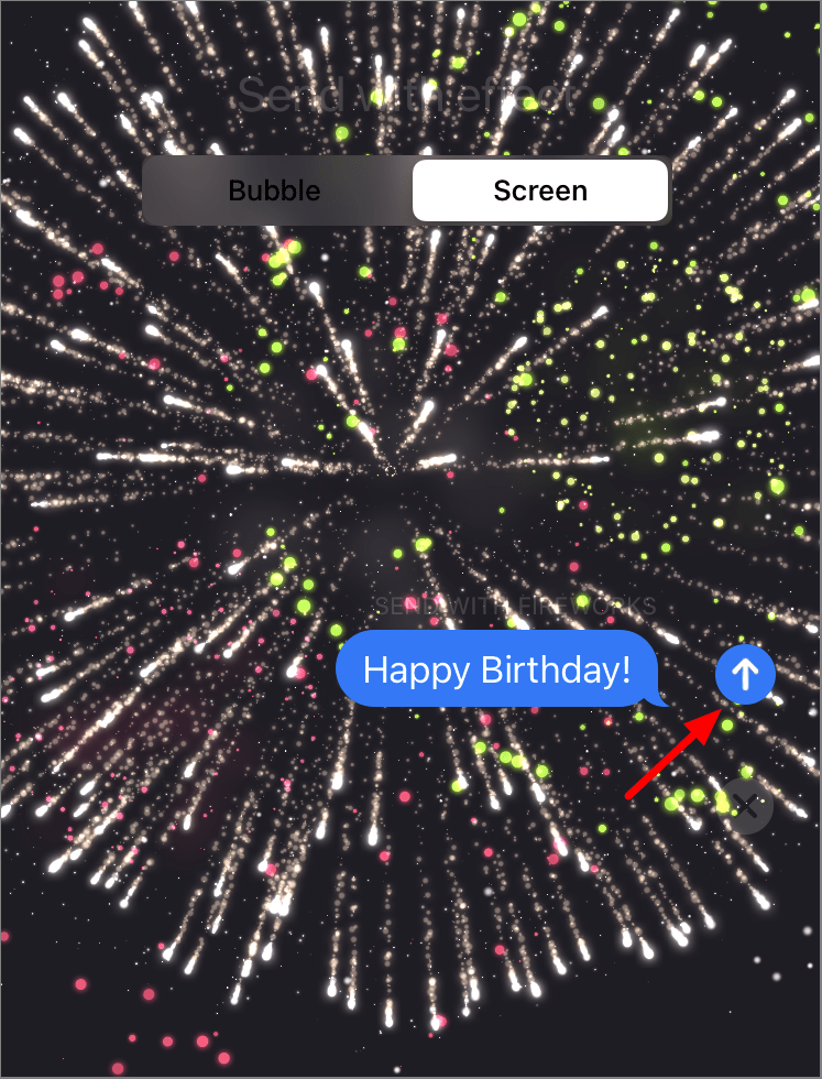 Step 4: After selecting the 'Fireworks' effect, tap the upward arrow button to send your message with the fireworks animation.