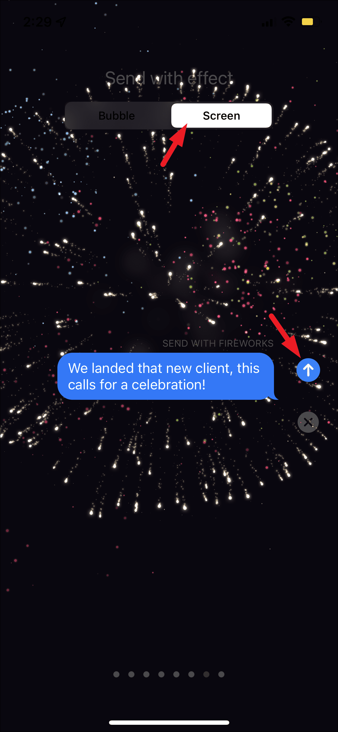 Now, from the ‘Send with effect’ screen, tap on the ‘Screen’ tab present on the top section of the screen. Then, swipe right to left six times to reach the ‘fireworks’ effect and tap on the ‘send’ button to send the message with the effect.