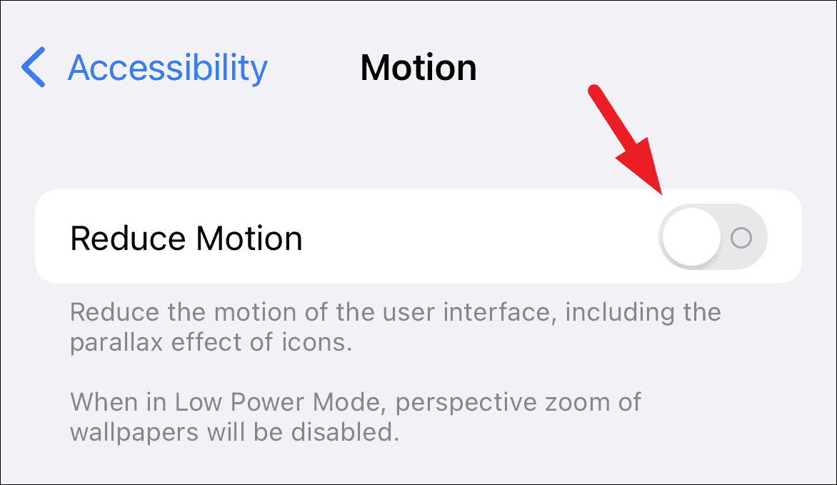 Now, locate the ‘Reduce Motion’ option and tap on the switch present on the far-right edge of the tile to the ‘Off’ position.