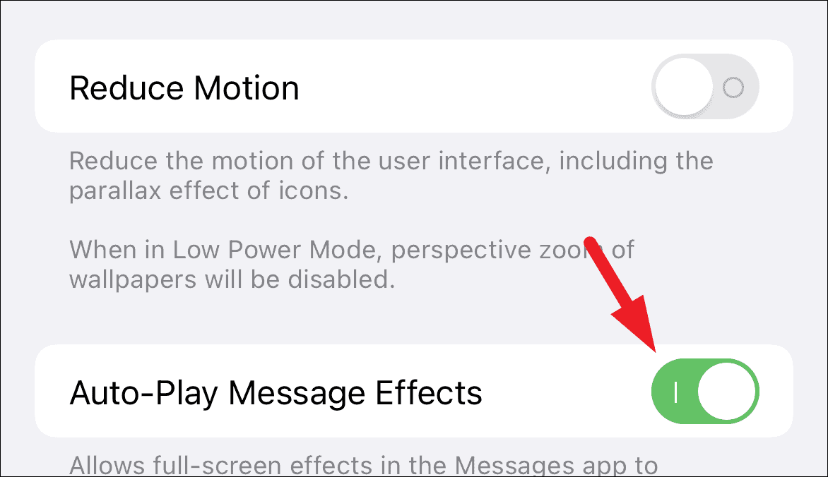 Also, locate the ‘Auto-Play Message Effects’ option situated just beneath the ‘Reduce Motion’ option; then, toggle the following switch to the ‘On’ position to make sure all the messages with effects will auto-play.